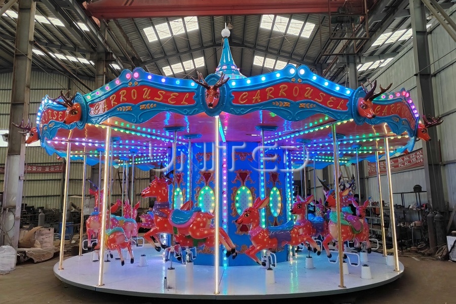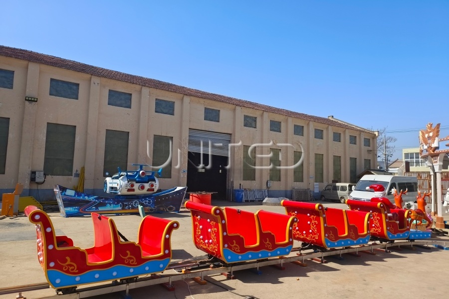 Transform your venue into a profitable winter wonderland with the exclusive range of Christmas-themed amusement park rides from United. Our diverse portfolio includes enchanting Santa Claus trackless trains that navigate through bustling shopping centers, reindeer-style carousels where traditional horses are replaced with magical stags and sleighs, and rotating flying chairs adorned with snowflakes and icy blue aesthetics.